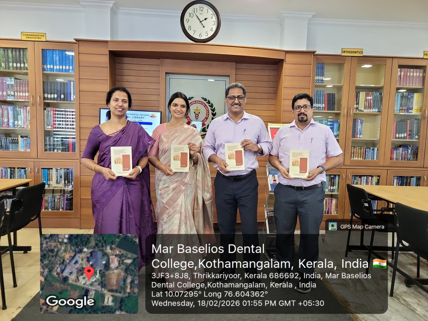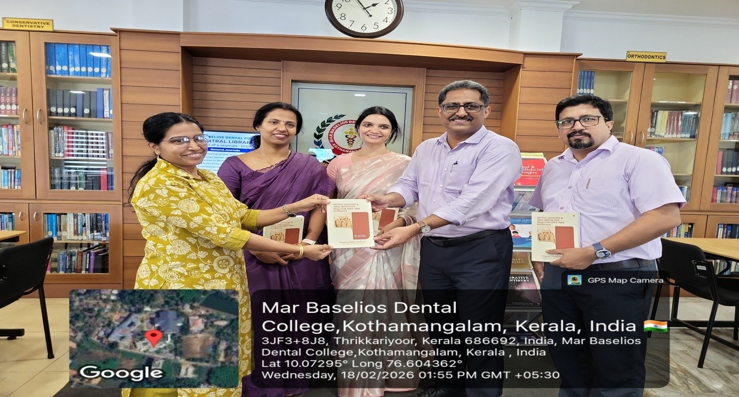 Dr. Pramod Philip Mathews, Chief Author (HOD, Dept. of Oral Pathology,MBDC) along with co-authors Dr. Soma Susan Varghese, Dr. Joseph Sebastian C, and Dr. Deepa Jose (Dept. Oral Pathology, MBDC) hand over copies of the book to the MBDC Central Library