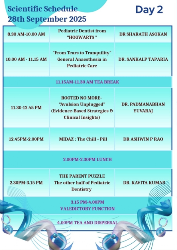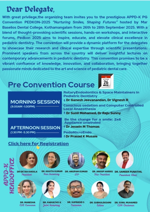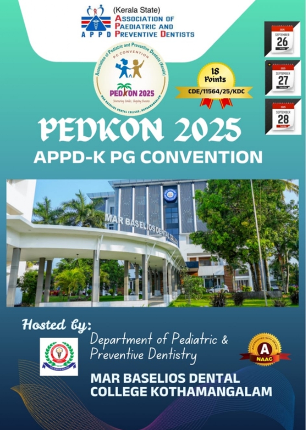 With great privilege,the organizing team invites you to the prestigious APPD-K PG Convention PEDKON-2025 “Nurturing Smiles, Shaping Futures” hosted by Mar Baselios Dental College, Kothamangalam from 26th to 28th September 2025. With a blend of thought-provoking scientific sessions, hands-on workshops, and interactive forums, Pedkon 2025 aims to inspire, educate, and elevate clinical excellence in pediatric dentistry. The convention will provide a dynamic platform for the delegates to showcase their research and clinical expertise through scientific presentations. Prominent speakers from across the country will deliver insightful lectures on contemporary advancements in pediatric dentistry. This convention promises to be a vibrant confluence of knowledge, innovation, and collaboration, bringing together passionate minds dedicated to the art and science of pediatric dental care.